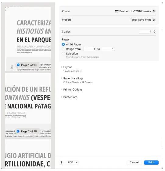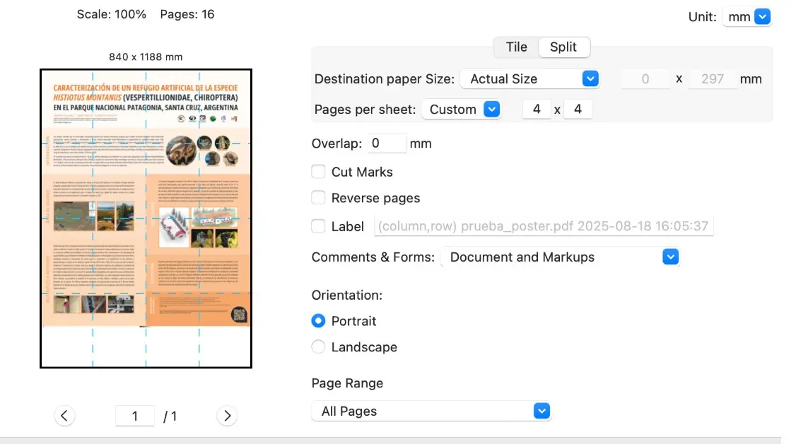 Si elegís la opción de reutilización de papel que ofrecemos, la dimensión final del póster será de 4 x 4 hojas A4, es decir, 84 cm de ancho y 118,8 cm de alto. La impresión será a color en papel común. Podés ver abajo la manera en la que se programa la impresión. Si elegís esta opción, tendrás que enviar el PDF de tu póster antes del martes 16/09. Dado que será una impresión en papel normal y sobre hojas reutilizadas, te recomendamos que tanto los colores como los diseños sean sencillos. Con esta opción, vos solo tenés que mandar el PDF y la impresión es sin costo.